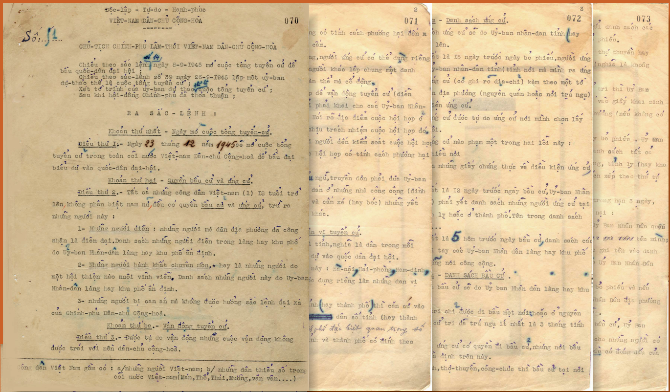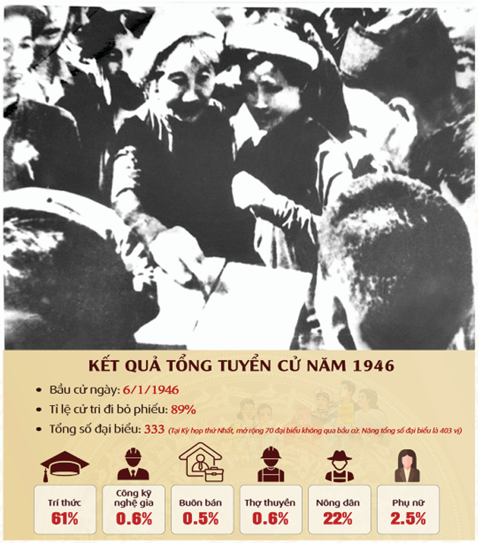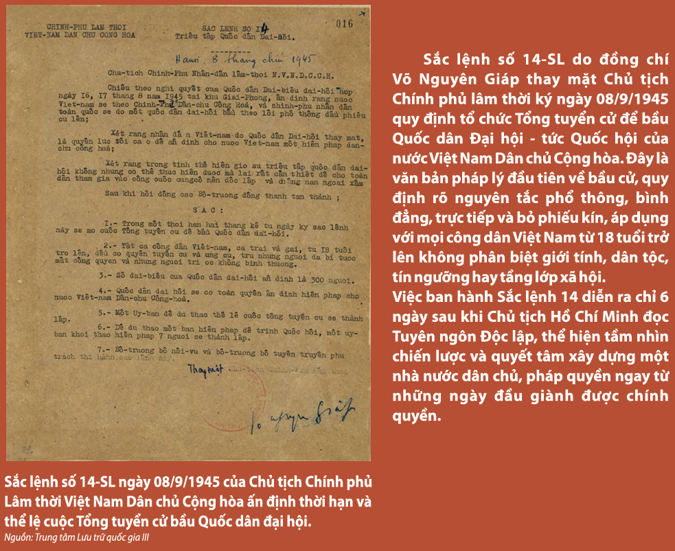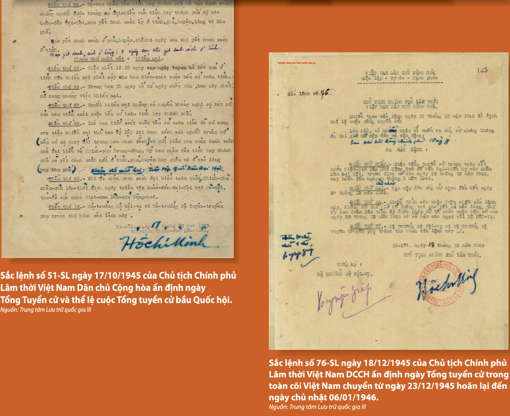 Để chuẩn bị cho Tổng tuyển cử, Chính phủ lâm thời đã ra sắc lệnh số 34-SL ngày 20-9-1945, thành lập Uỷ ban dự thảo Hiến pháp gồm có: Hồ Chí Minh, Vĩnh Thụy, Đặng Thai Mai, Vũ Trọng Khánh, Lê Văn Hiến, Nguyễn Lương Bằng, Đặng Xuân Khu. Sắc lệnh số 39-SL ngày 26-9-1945 về thành lập Uỷ ban dự thảo thể lệ cuộc Tổng tuyển cử. Sắc lệnh số 51-SL ngày 17-10-1945 quy định thể lệ cuộc Tổng tuyển cử phải được tiến hành theo lối phổ thông đầu phiếu bầu cử trực tiếp và bí mật.