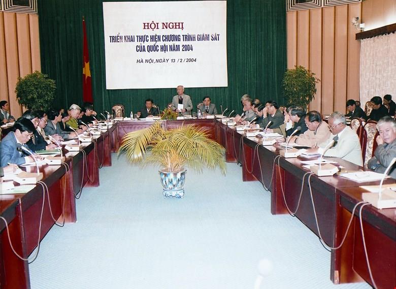 Đặc biệt, trong nhiệm kỳ khoá XI Quốc hội đã Luật hoạt động giám sát của Quốc hội năm 2003, luật này là cơ sở pháp lý quan trọng cụ thể hóa chức năng giám sát tối cao của Quốc hội, nhiệm vụ giám sát việc thi hành Hiến pháp, pháp luật của các cơ quan của Quốc hội, đại biểu Quốc hội và Đoàn đại biểu Quốc hội. Hoạt động giám sát của Quốc hội đã được tăng cường và đẩy mạnh nhất là sau khi Luật hoạt động giám sát của Quốc hội được ban hành, tạo thêm cơ sở pháp lý quan trọng để Quốc hội, các cơ quan của Quốc hội thực hiện quyền giám sát chủ động, tích cực, đầy đủ và có nề nếp hơn theo chương trình, kế hoạch. Nội dung giám sát tập trung vào nhiều vấn đề bức xúc trong cuộc sống, bao quát hầu hết các lĩnh vực từ kinh tế-ngân sách, văn hóa, xã hội, giáo dục, khoa học-công nghệ, quốc phòng-an ninh đến đối ngoại, công tác tư pháp. Quốc hội đã tăng cường giám sát tối cao tại kỳ họp về các chuyên đề. Cụ thể là trong lĩnh vực kinh tế và ngân sách Nhà nước, Quốc hội đã tập trung giám sát việc triển khai thực hiện nghị quyết của Quốc hội về nhiệm vụ và về ngân sách Nhà nước, trong đó có những vấn đề nóng bỏng, cấp bách nổi lên như thu chi ngân sách, các biện pháp tăng thu, giảm chi, giảm bội chi ngân sách, kiềm chế lạm phát, thực hành tiết kiệm, chống lãng phí, đầu tư vốn cho phát triển, hoạt động của ngân hàng, hoạt động xuất khẩu, nhập khẩu, tình trạng nhập siêu quá lớn; khắc phục tình trạng đầu tư dàn trải, chống thất thoát trong đầu tư xây dựng cơ bản; quy hoạch, kế hoạch sử dụng đất; việc triển khai thực hiện dự án nhà máy lọc dầu Dung Quất, chương trình trồng mới 5 triệu ha rừng...
